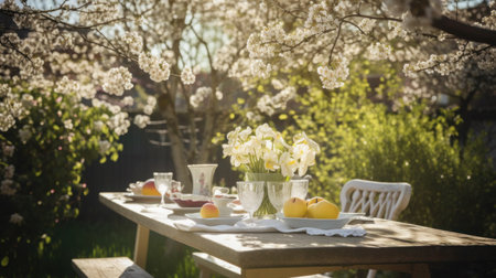 Table set for a picnic in the garden with blooming spring flowers