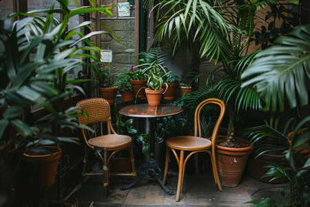 A couple of chairs placed alongside a table in a cozy nook, A cozy nook tucked away in a corner, complete with a small table and chairs surrounded by potted plants