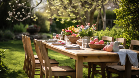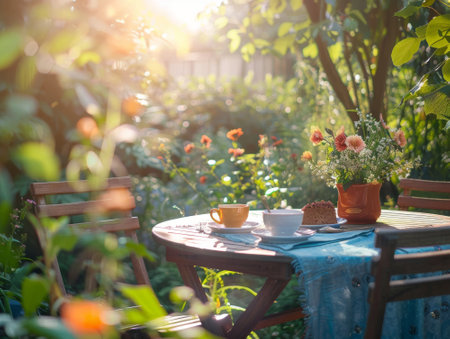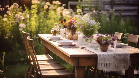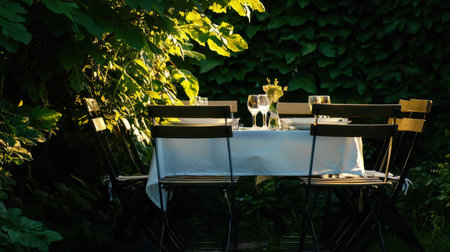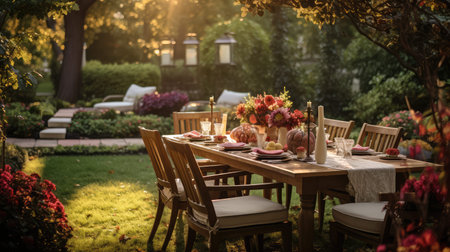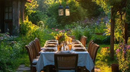 A beautifully arranged outdoor dining table in a vibrant garden, illuminated by warm golden sunlight, creating an inviting and serene atmosphere for gatherings.