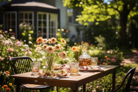 Brunch on the terrace in the summer in the garden, generative ai