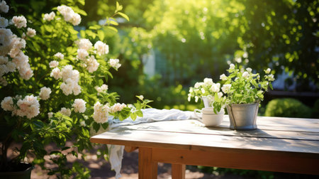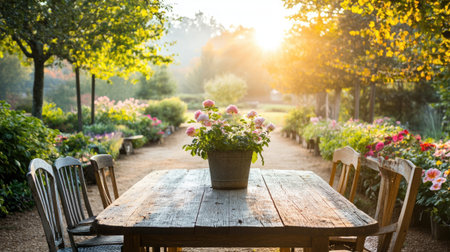 A serene garden scene features a rustic wooden table adorned with a flower pot, surrounded by blooming plants and bathed in warm sunrise light.