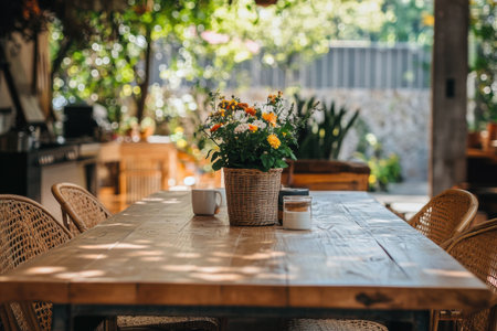 light blue wood table illustration vibrant serene, inviting space, setting lush light blue wood table