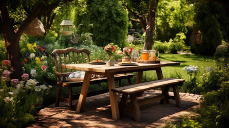 A picnic table surrounded by flowers and plants. AI generative image.