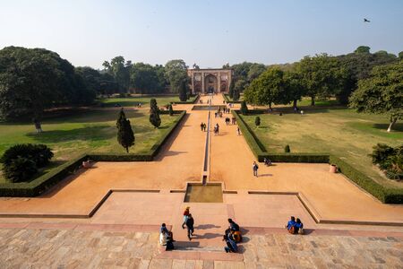 New Delhi, India - January 5, 2020: Tourists enjoy Humayan's Tomb Complex - view taken from the top of the tomb looking down