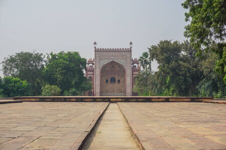 AGRA, INDIA - JANUARY 02, 2019 : The entrance of Taj Mahal mausoleum in the fog with view of tourists enjoying the view at Agra, Uttar Pradesh, India.