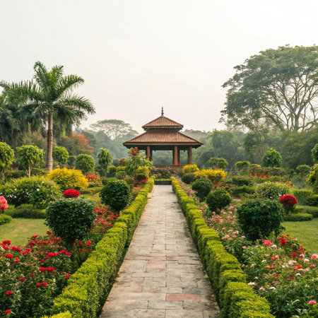 An aerial view showcasing a beautifully designed garden with symmetrical patterns, tranquil water features, and lush greenery, perfect for relaxation and leisure.