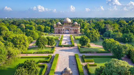 A mesmerizing,isometric view with palm trees and blue sky of safdarjung tomb memorial from the main gate,entrance at winter morning.