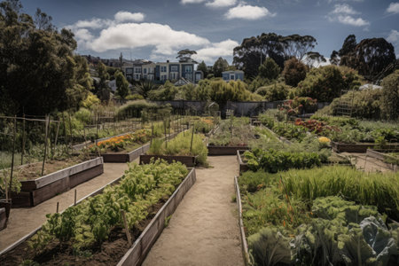 community garden, with rows of vegetables and herbs growing in the sunshine, created with generative ai