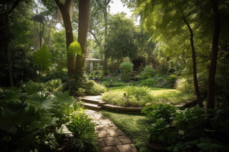 lush garden surrounded by towering trees, creating a serene environment, created with generative ai