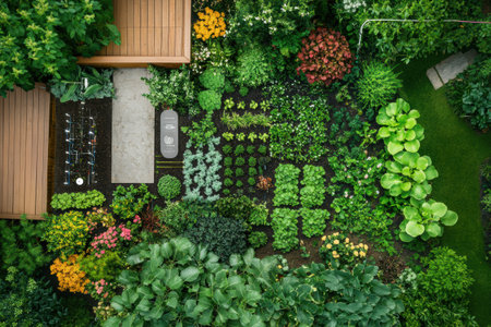 Stunning aerial view of an intricately designed garden featuring diverse plant life, rich greenery, and a peaceful atmosphere perfect for relaxation and inspiration.