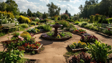 Vibrant garden filled with colorful flowers, lush greenery, and central fountain creates serene atmosphere. Benches are placed along pathways, inviting visitors to relax and enjoy nature beauty