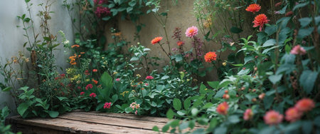 A vibrant display of wildflowers in various colors grows abundantly among lush green foliage. The wooden planks create a warm contrast against the floral riot.