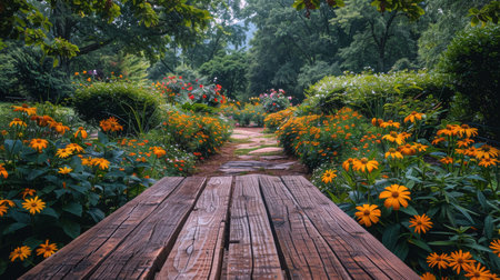 A wooden table surrounded by a variety of colorful flowers in a garden setting. The flowers fill the garden with vibrant hues, creating a beautiful and lively scene.