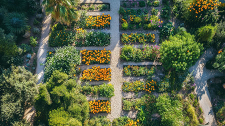 Stunning aerial photograph of a beautifully arranged botanical garden, filled with colorful blooms and lush greenery, creating a tranquil natural oasis.