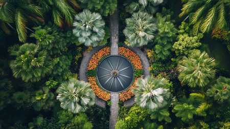 Experience the serene beauty of an aerial view showcasing the intricate design of a vibrant botanical garden with lush plant life and reflective water features.