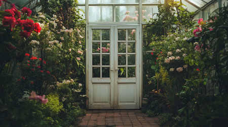Beautiful garden with white door and flowers. Vintage tone filter.