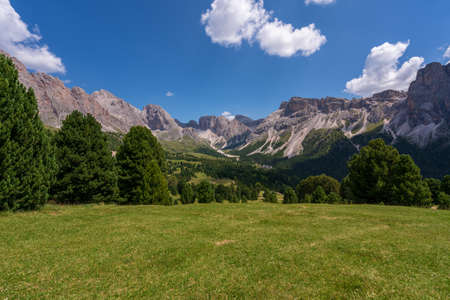 Mountain landscape in the Dolomites, Italy. Green meadows and mountains