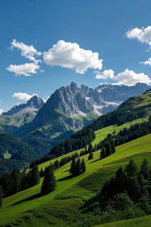Idyllic landscape in Alps with green field on hill and rocky mountain under cloud on peaceful blue sky. Copy space in right side