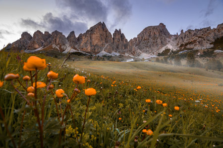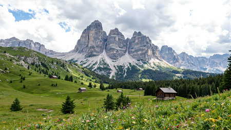 Tranquil Dolomite Alps scene with jagged peaks meadows huts and blooming wildflowers