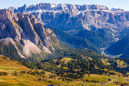 breathtaking mountain landscape of Sassolungo summit in the Dolomites of Val Gardena, above Selva Wolkenstein, South Tyrol, Italy
