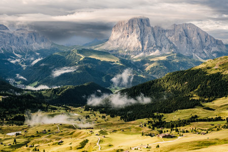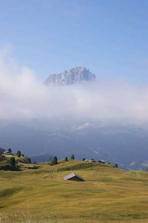 Langkofel (Sassolungo in Italian, Saslonch in Ladin) view from Col Raiser in a misty morning. This mountain range is part of the Dolomites and divides the Fascia valley (Val di Fassa in Italian, Val de Fascia in Ladin, Fassatal in German) from Val Gardena