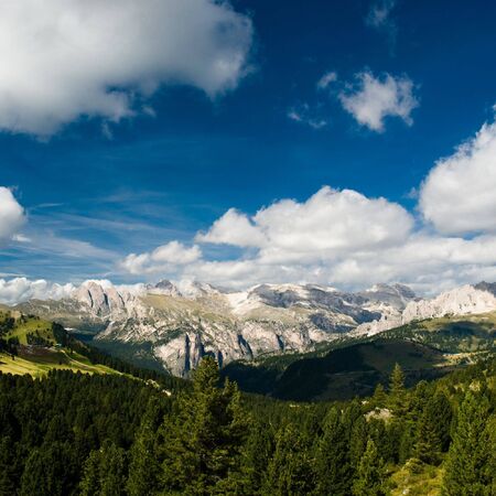 panoramic view of the forests and mountains of the Dolomites, Italy.