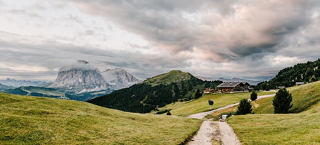 Panoramic view of the Seceda, high mountain in the Dolomites in South Tyrol, Italy.