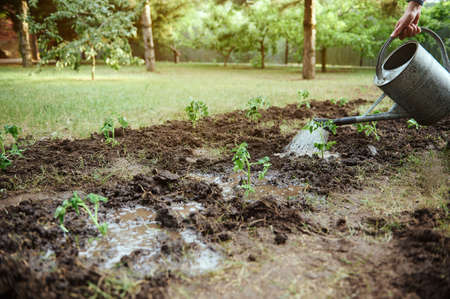 Close-up. Using a watering can for watering freshly planted seedlings of tomatoes in the black soil in a flower bed by irrigation. Eco farming, growing organic healthy vegetables on an eco farm