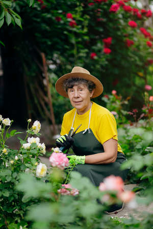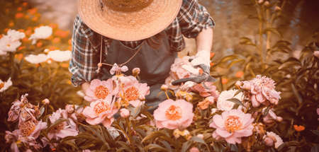 Senior woman gardener in a hat working in her yard and trimming flowers with secateurs. The concept of gardening, growing and caring for flowers and plants.