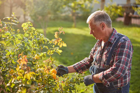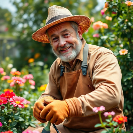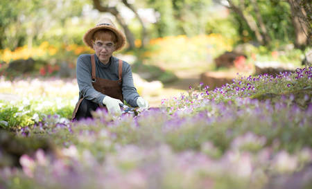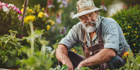 Planting nature growing care flowers outdoors men gardening retired adult person summer senior male