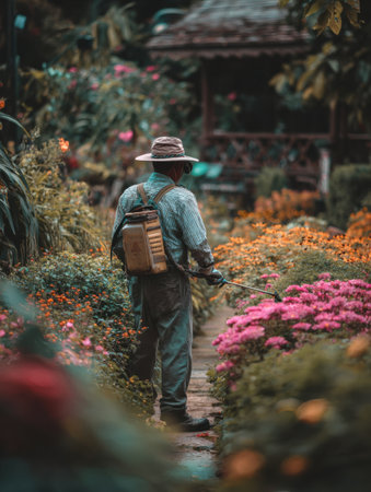 Gardener wears a hat and protective gear while spraying plants in a colorful garden filled with various flowers during daylight hours.