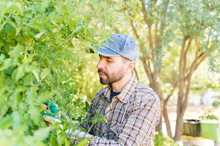 The picture of the urban farmer working inside the greenhouse to harvest a vegetable, the urban farmer requires skills like the management, physical fitness, weather monitoring and experience. AIG43.