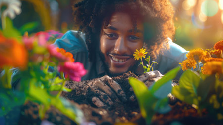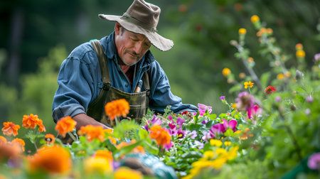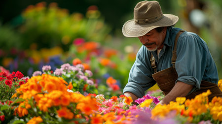 A gardener tends to vibrant blooms, cultivating a tapestry of colors and scents.