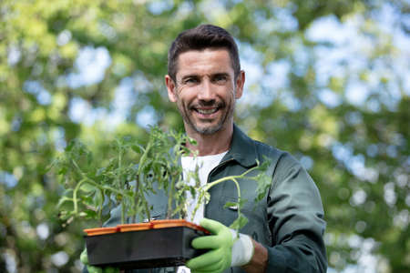 Man gardener in green cap holds wooden box with houseplants in front of living evergreen fence Phillyrea latifolia. Delivery of seedlings from plant nursery. Small business, hobby, gardening. Mock up