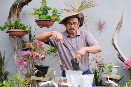 Portrait of senior man working in his garden. Senior gardener working in his garden.