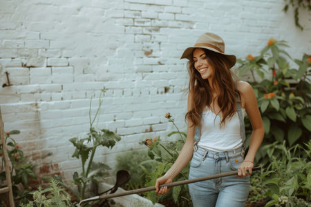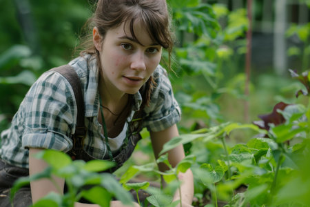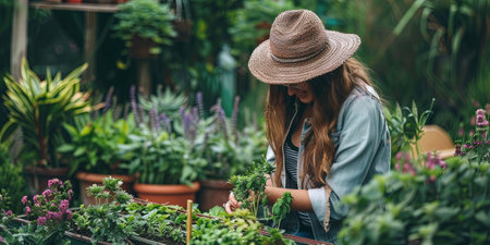 Caucasian woman caring for vibrant green plants in a lush and thriving garden environment