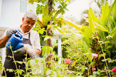 Old Asian man takes care of watering roses by using watering. can in the front garden, a daily hobby that keeps you mental and healthy.