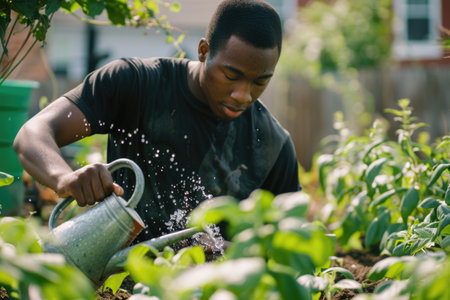 Male African elderly gardening in backyard plants grass. Generative AI AIG23.