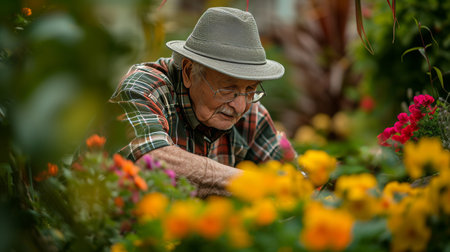 Aging Society old man in a hat and plaid shirt decorate his flower garden alone AI generated