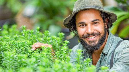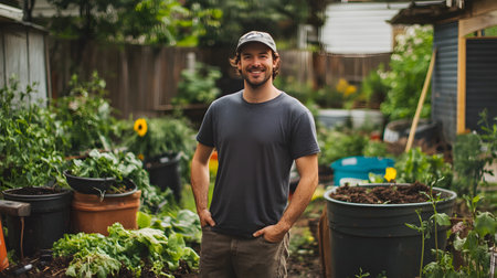 A smiling man stands confidently in a thriving garden filled with various plants and greenery, showcasing the joy of gardening.