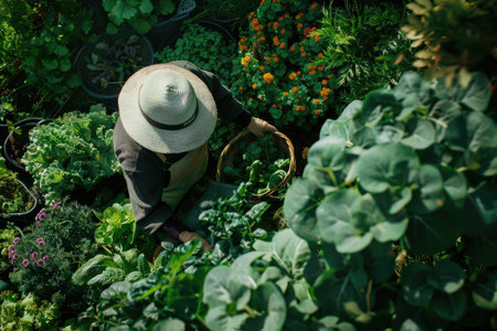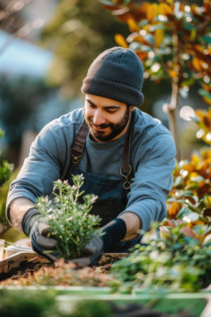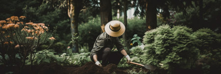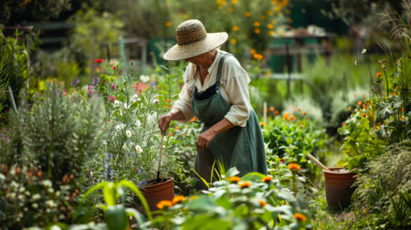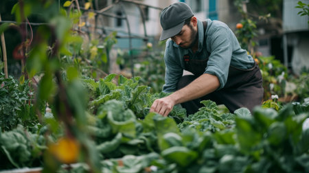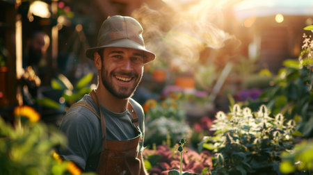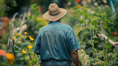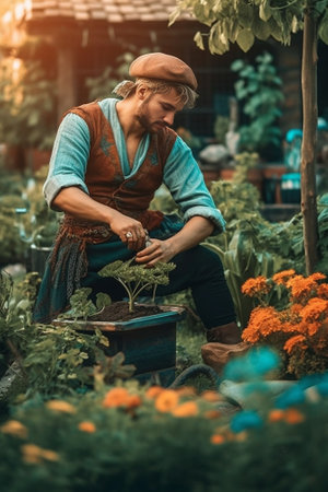 A man wearing a hat and apron works diligently in a garden, surrounded by plants and tools. The sun shines down as he tends to the plants with care.