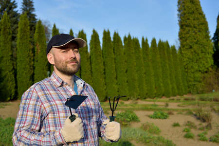 Summertime. A bearded, handsome gardener in uniform and a straw hat sits and relax at his kitchen-garden. In the background there is a backyard and a garden. The concept of gardening and horticulture