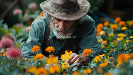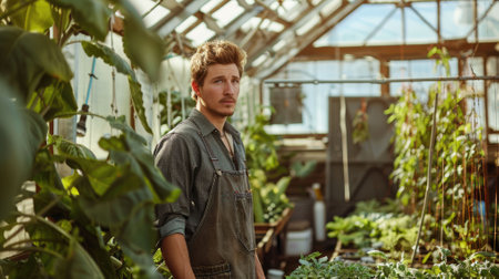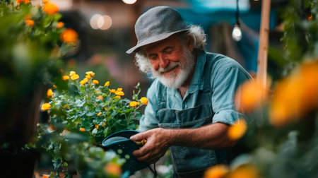 A seasoned gardener, his face etched with wisdom, carefully arranges potted plants in a sun-drenched greenhouse His gentle touch and serene expression embody the peaceful tranquility of tending to nature This photograph captures the essence of horticultural expertise, a moment of quiet contemplation amidst vibrant life AI Generative