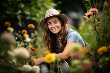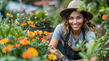 A happiness woman with gardening gloves sitting in flower garden and watering . AI Generated.