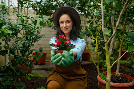 Smiling senior gardener in hat and gloves working with flowers in greenhouse