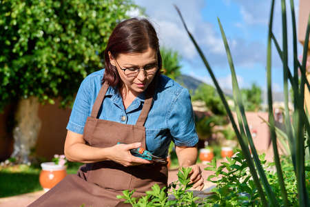 Middle-aged woman in the garden picking mint herbs for food and drink.