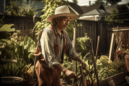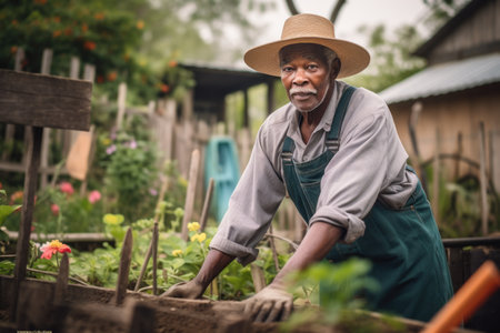 Male Native American 60s gardening in backyard plants overalls. Generative AI AIG23.
