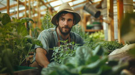 A man is carefully examining and nurturing mint plants in a greenhouse surrounded by lush greenery and soft lighting.