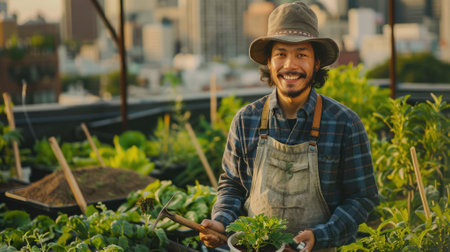 The picture of the gardener working on the rooftop inside the urban area about gardening the vegetable garden, the gardener require skill like soil management, plant knowledge and pest control. AIG43.