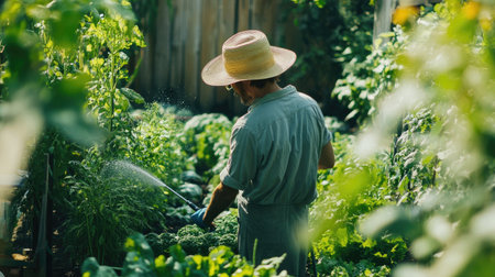 A gardener in a straw hat standing in a lush summer garden, gently watering vegetable plants from a hose, with vibrant greenery all around